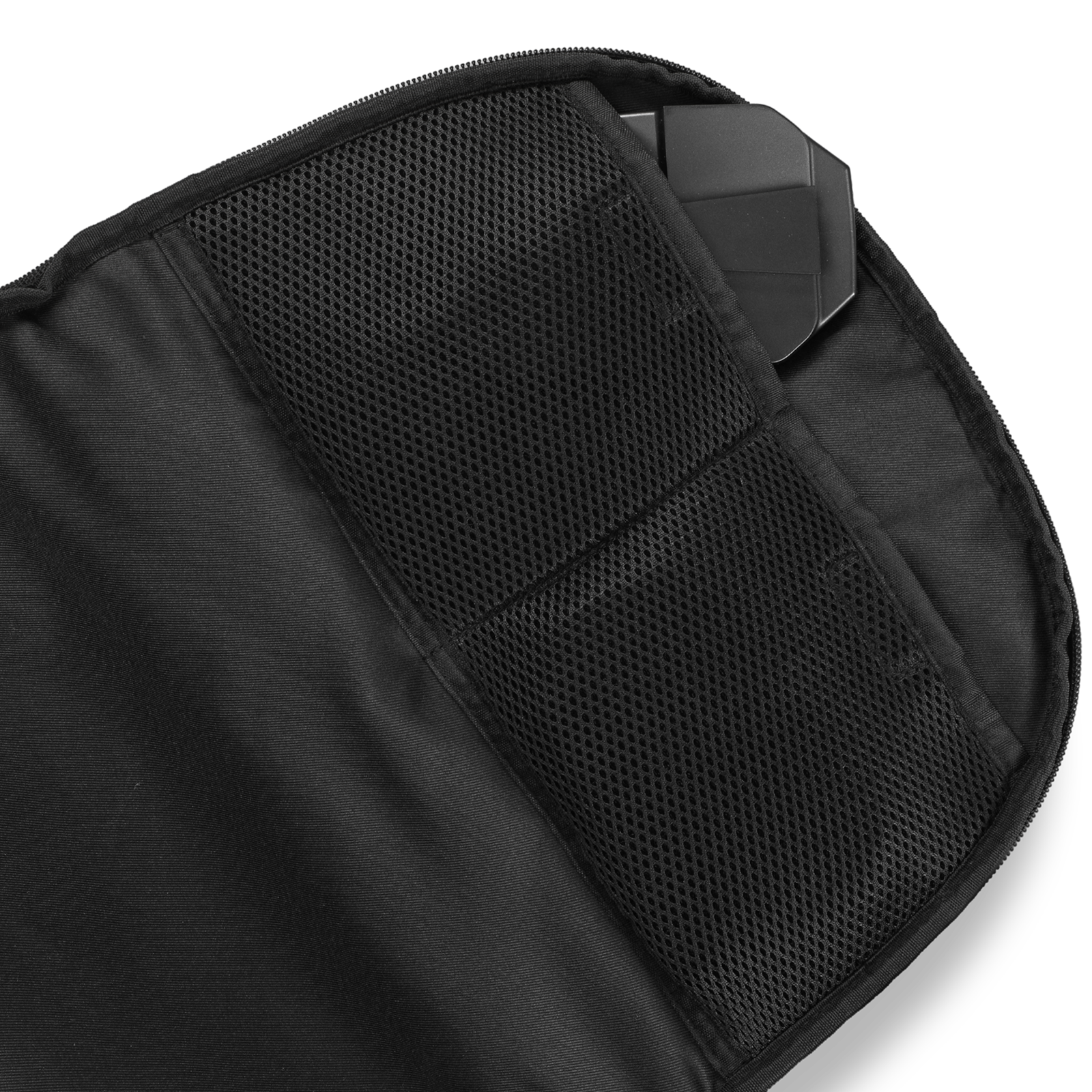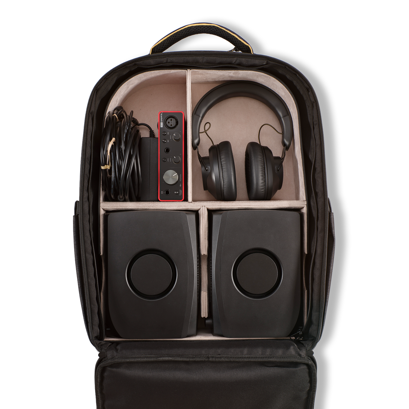 Der vordere und größte Bereich des Rucksacks verfügt über eine formstabile, herausnehmbare Einlage mit vier gepolsterten Fächern für maximalen Schutz deiner Geräte. Die beiden unteren Fächer sind identisch und genau an die Abmessungen der D3Vs angepasst, einschließlich einer Aussparung für den Lautstärkeregler. Die oberen Fächer bieten Platz für Kabel und ein Interface, wobei das größere Fach speziell für den geschlossenen ADAM Audio H200 Kopfhörer ausgelegt ist. Es gibt zwei weitere kleine Fächer zur Aufbewahrung der abnehmbaren Füße der D3Vs. Dieser gesamte Bereich lässt sich mit einem integrierten Netz verschließen, damit dein Equipment während des Transports sicher an seinem Platz bleibt.